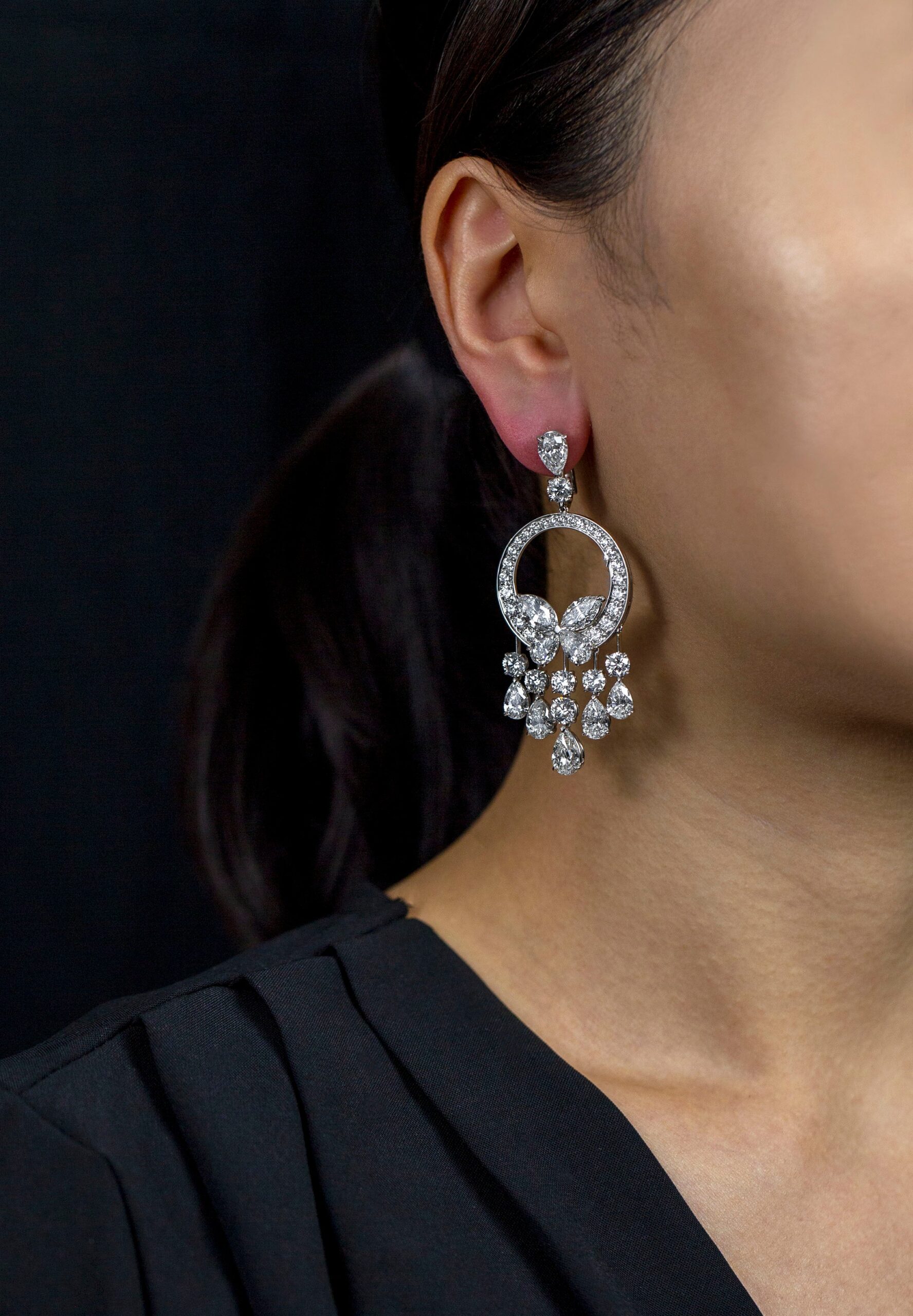 A well-crafted pair of dangle earrings, showcasing mixed-cut diamonds weighing 28.19 carats total, set in an open-work design. Accented by a butterfly motif made of pear and marquise shape diamonds. Finished with pear and round shape diamond fringes. Comes with omega clips and collapsible posts. Finely made with platinum.
