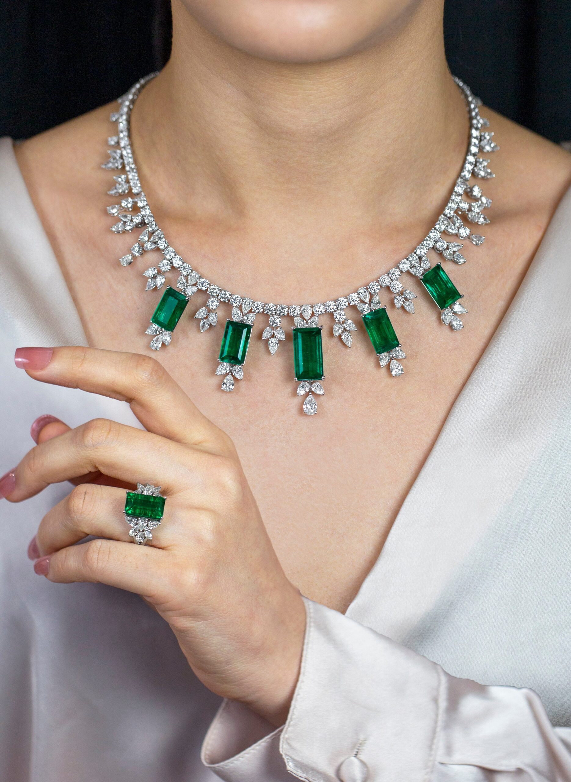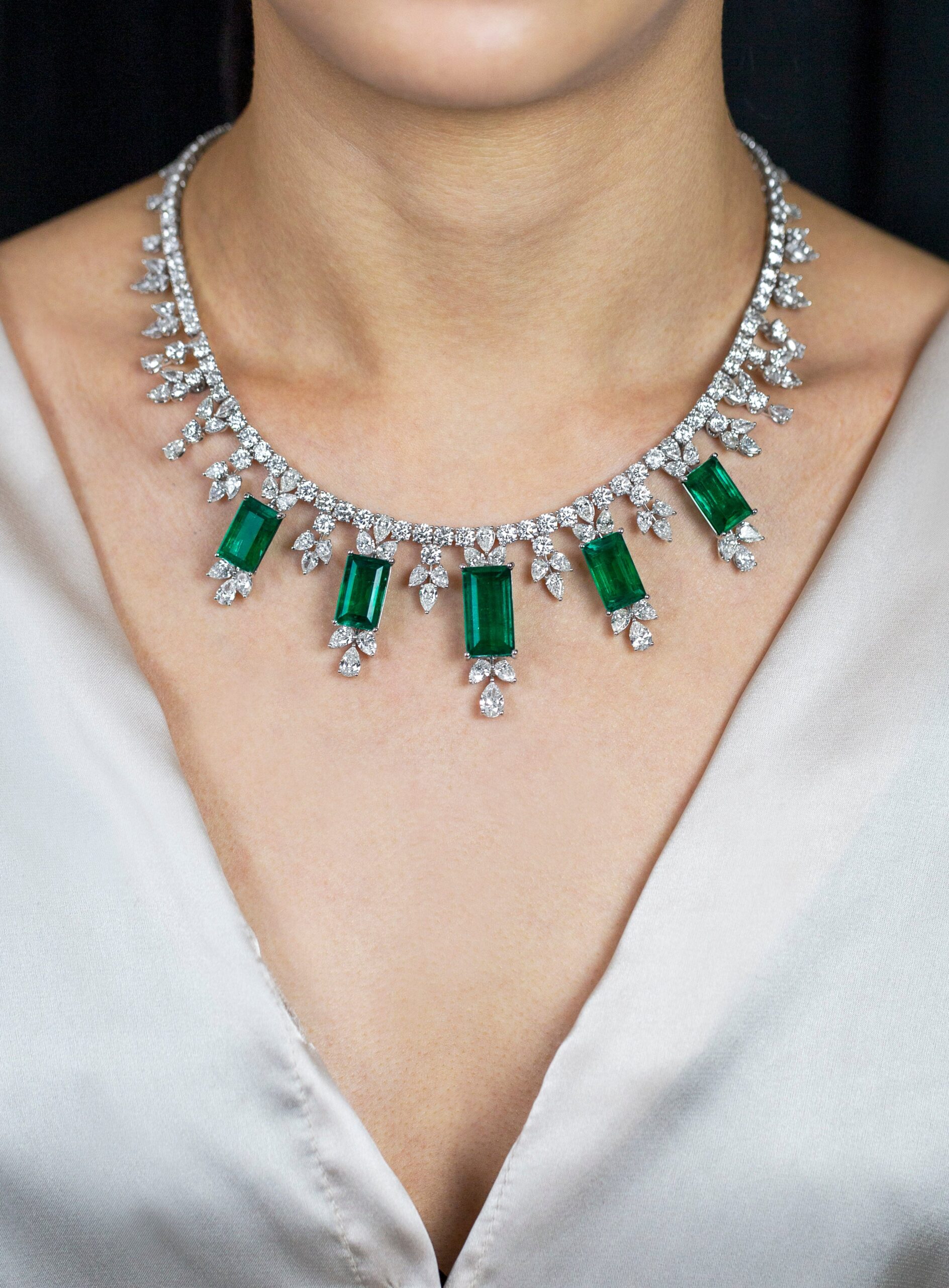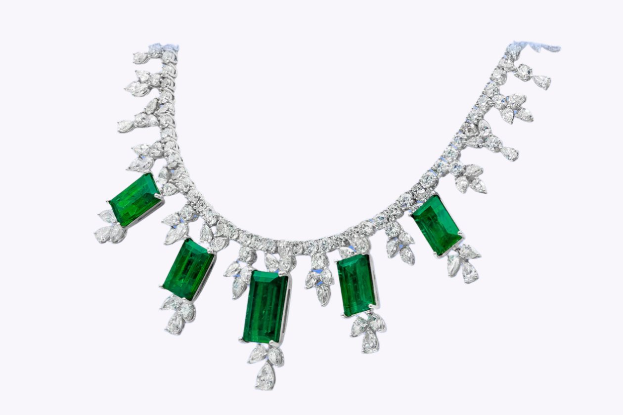48.68 Carats Total Colombian Emerald & Diamond Necklace in White Gold