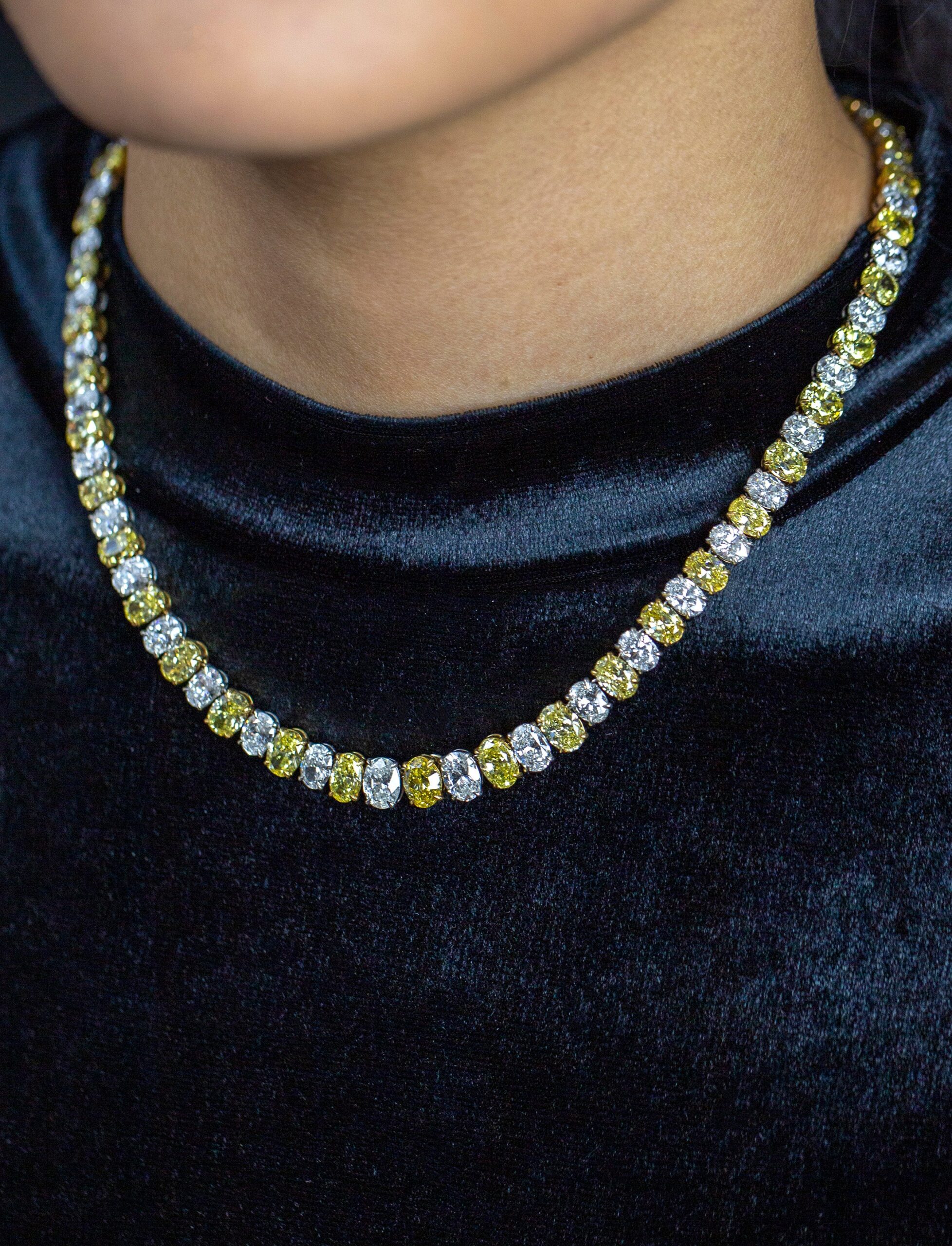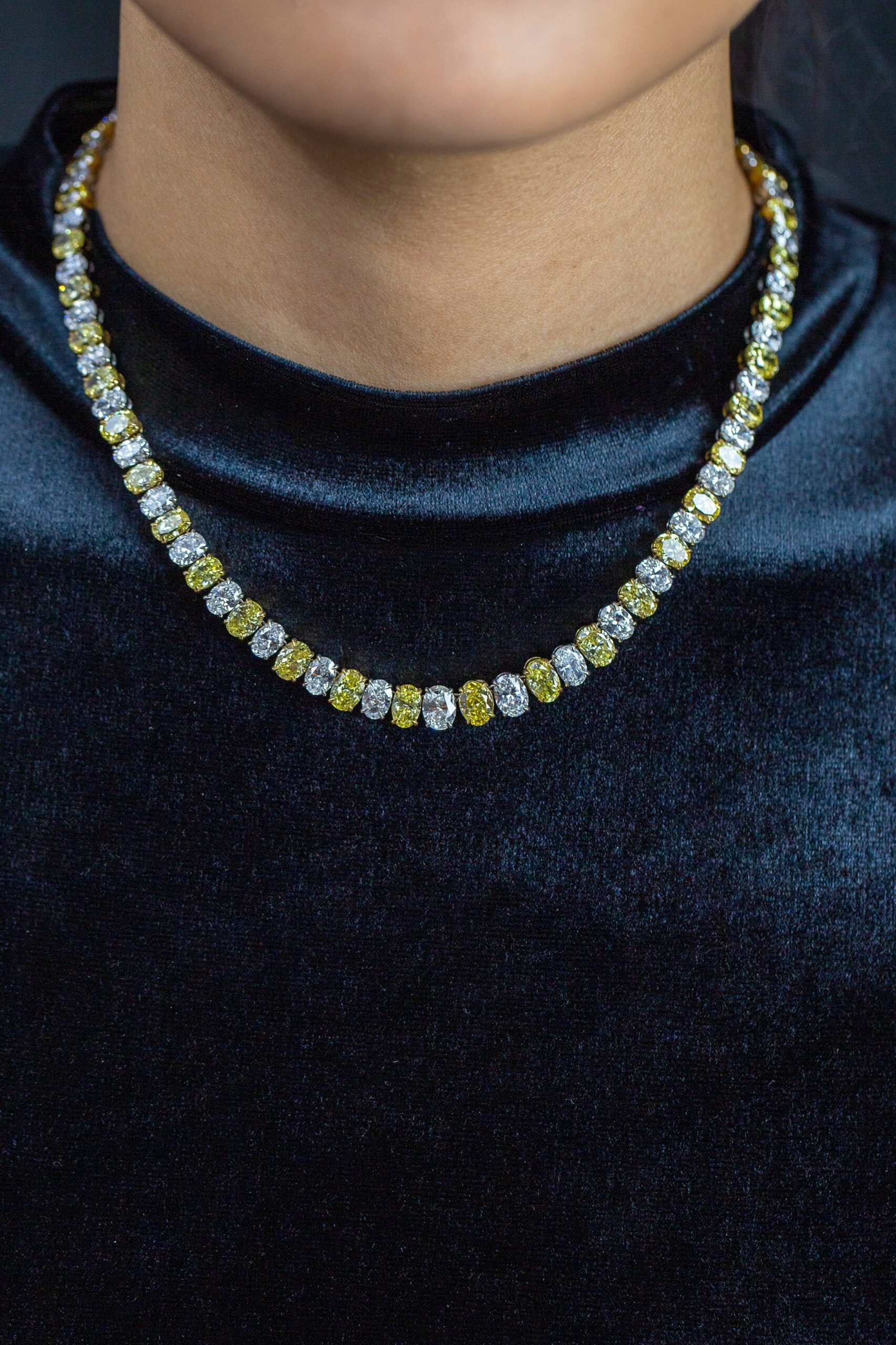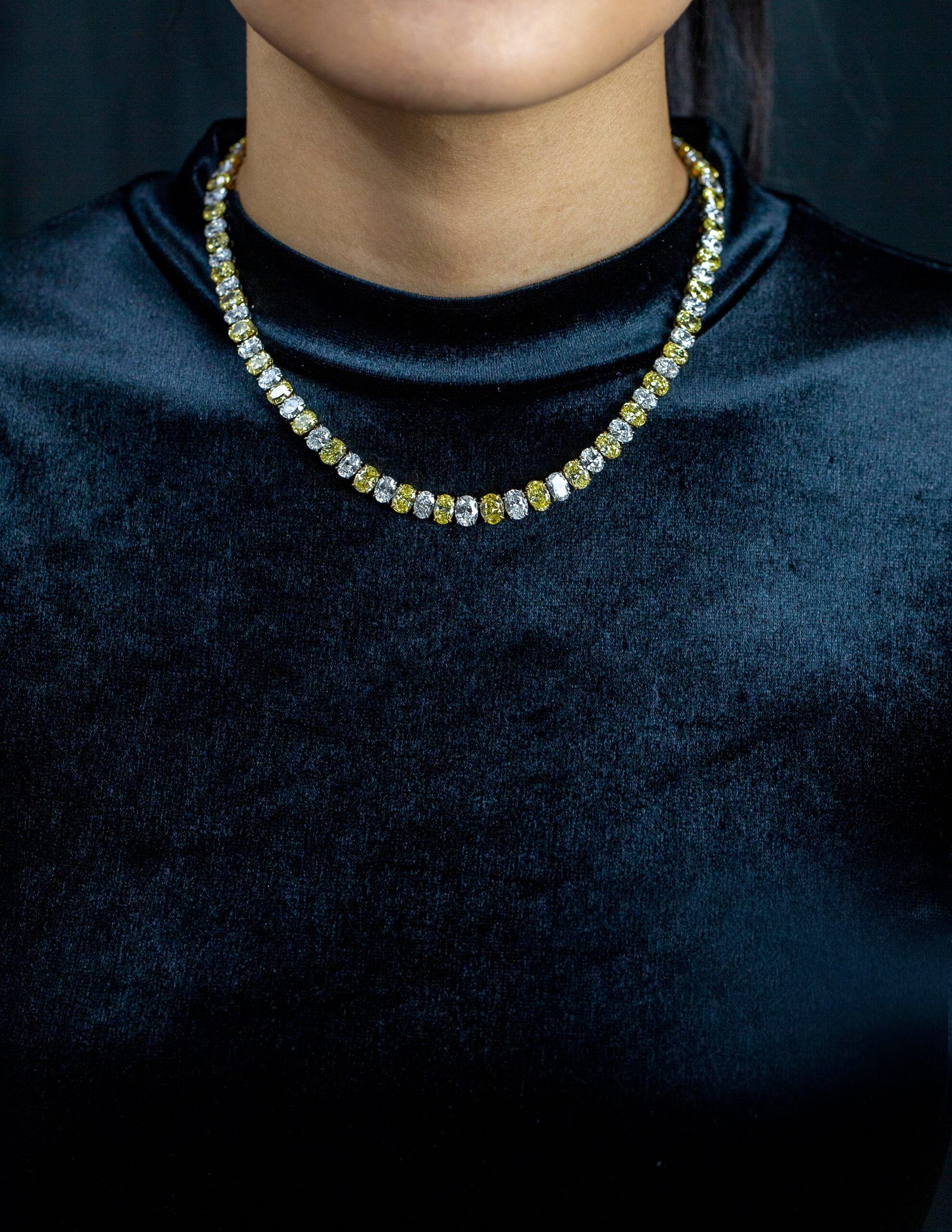 A spectacular high-end necklace, showcasing 43 oval cut fancy yellow diamonds weighing 31.14 carats total, set on 18K yellow gold. Alternating elegantly with 43 oval brilliant cut diamonds weighing 23.61 carats total, set on a 18K white gold. Finely made with platinum and comes with an invisible clasp for maximum brilliance.  Serenity Gallerie is a custom house, specializing in creating anything you can imagine. If you would like to receive a special quote on a custom piece, please message or call us.