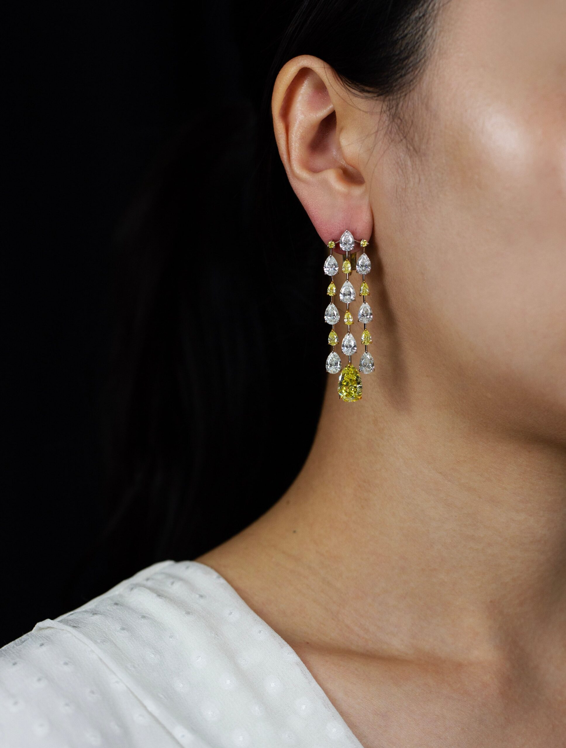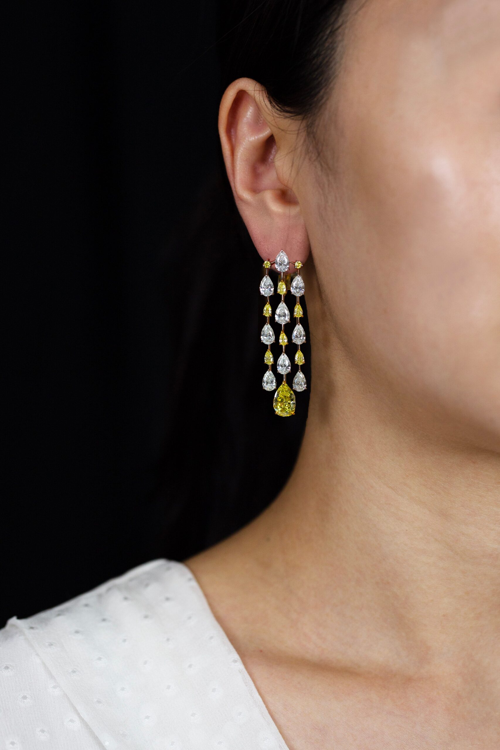 GIA Certified 15.69 Carats Total Pear Shape Yellow & White Diamond Chandelier Earrings in Platinum & White Gold