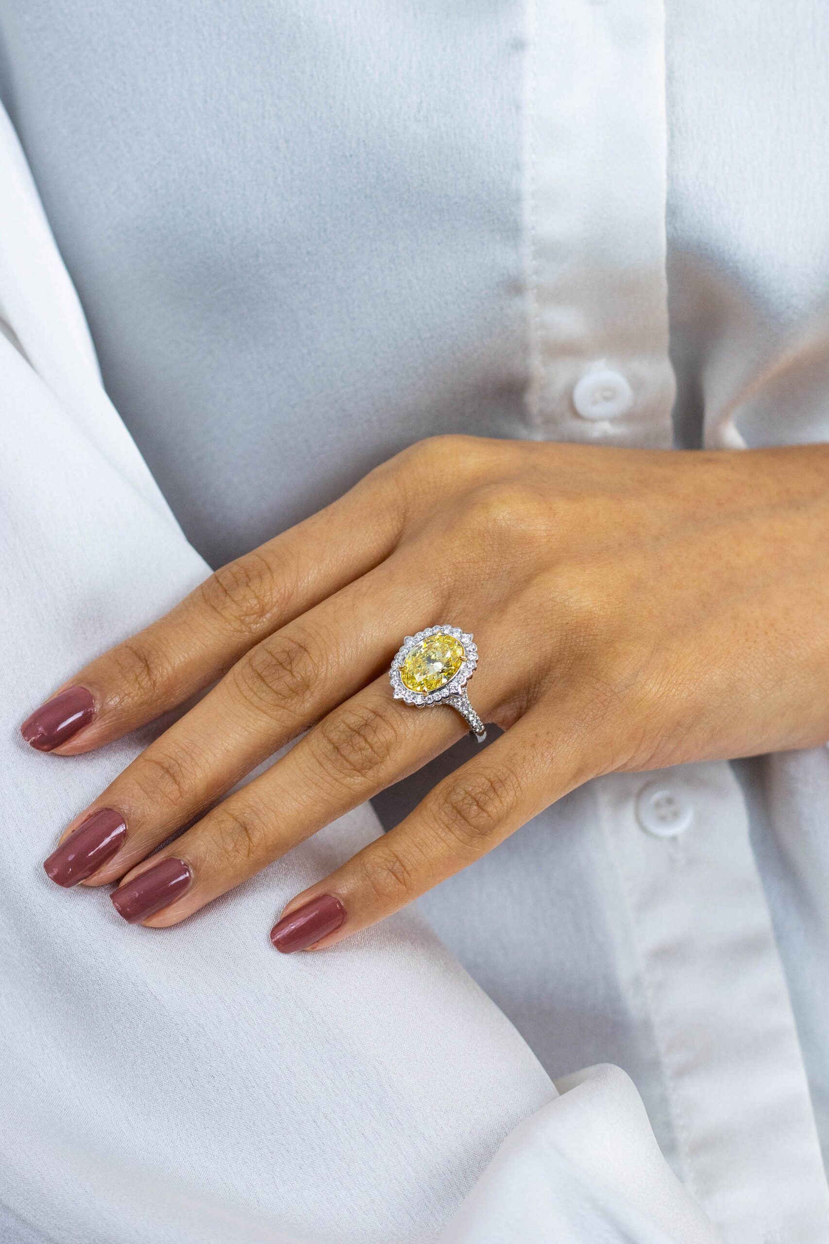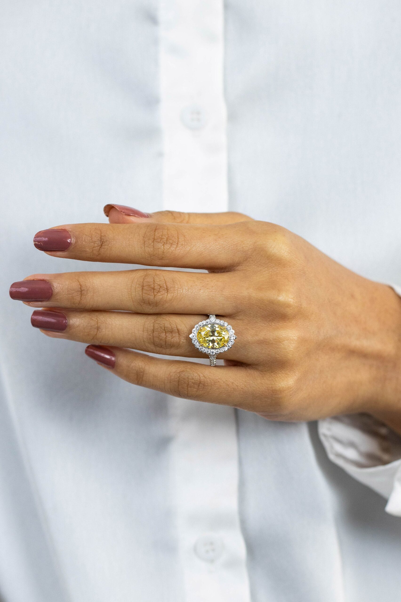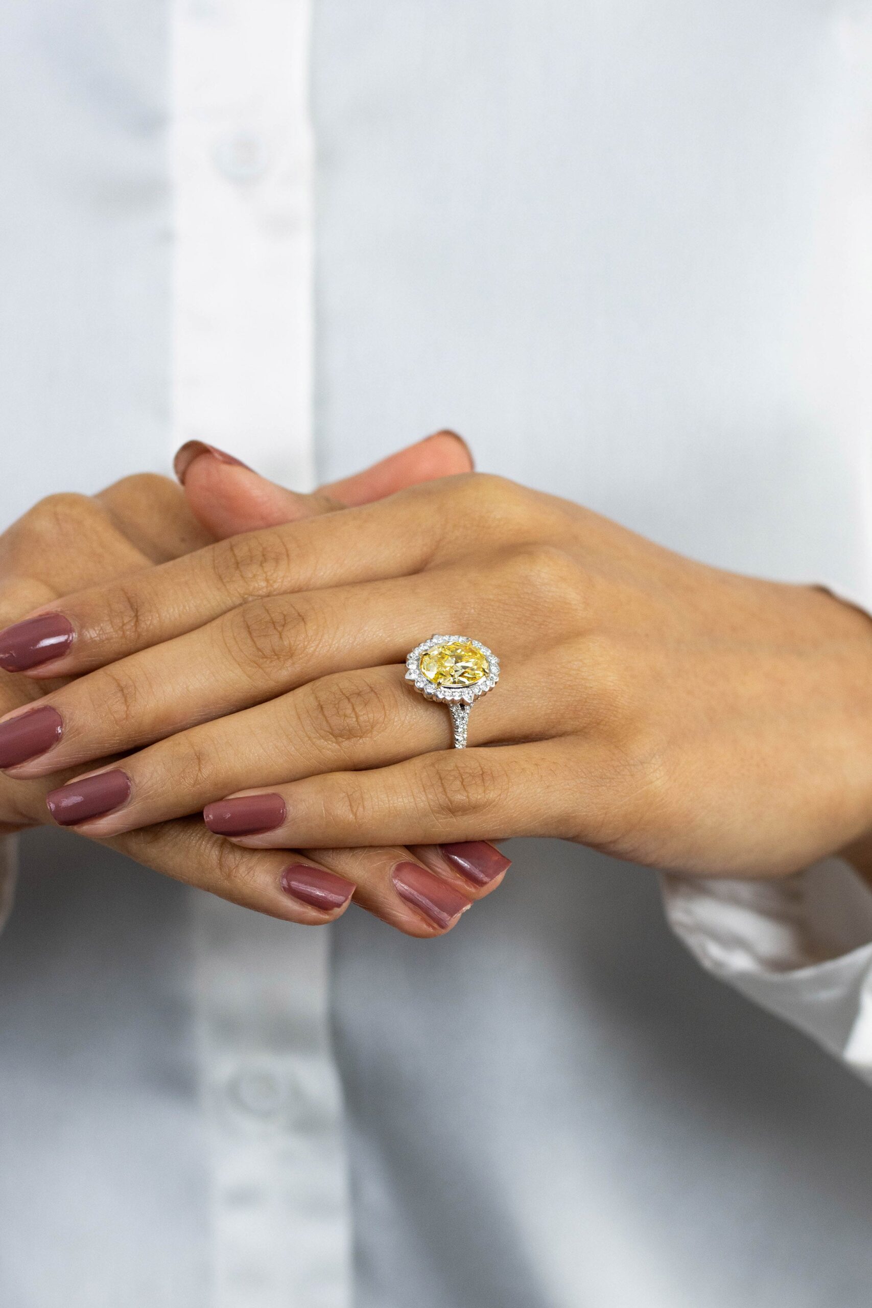GIA Certified 3.39 Carats Oval Cut Yellow Diamond Halo Engagement Ring in Yellow Gold & Platinum