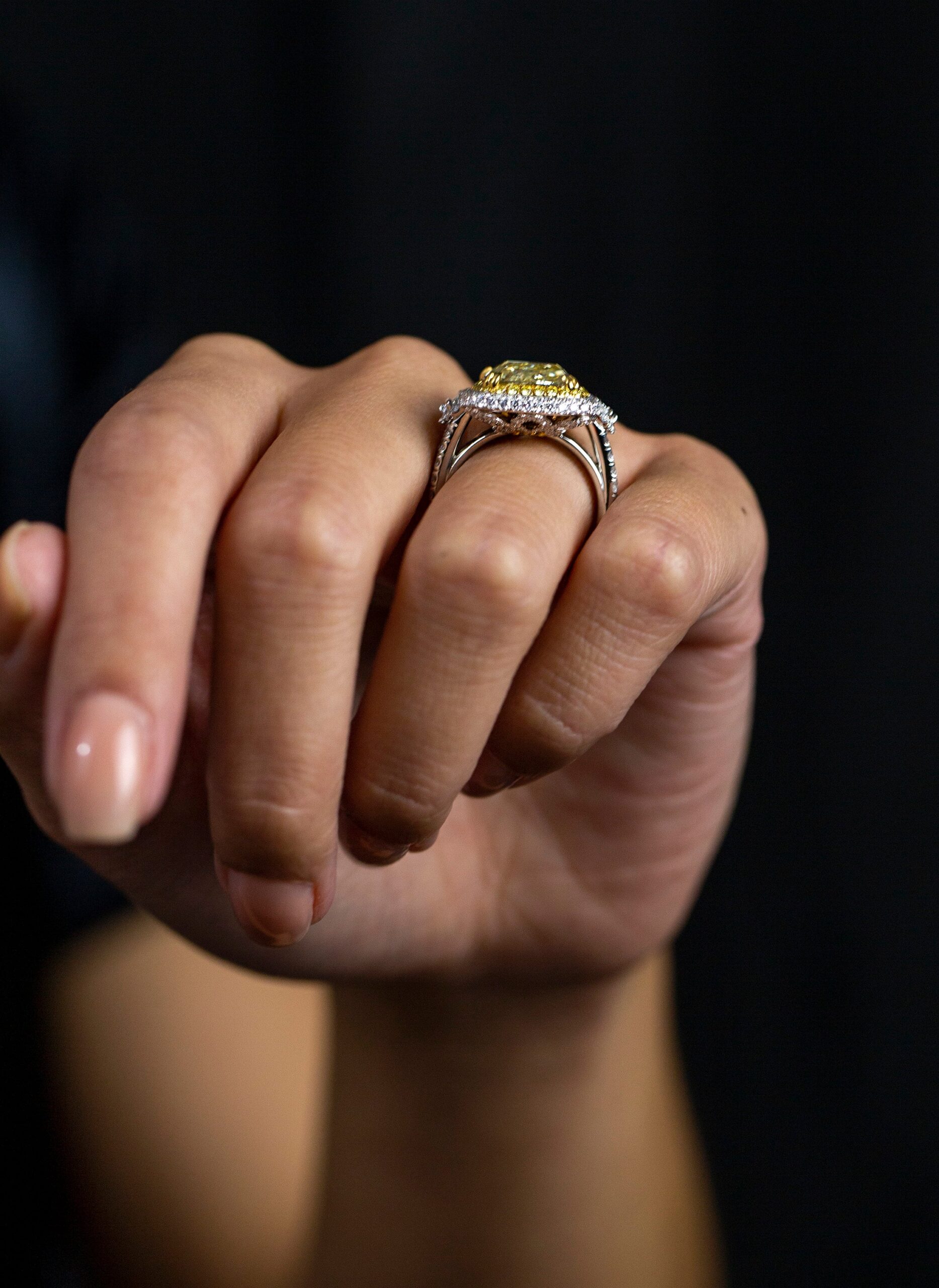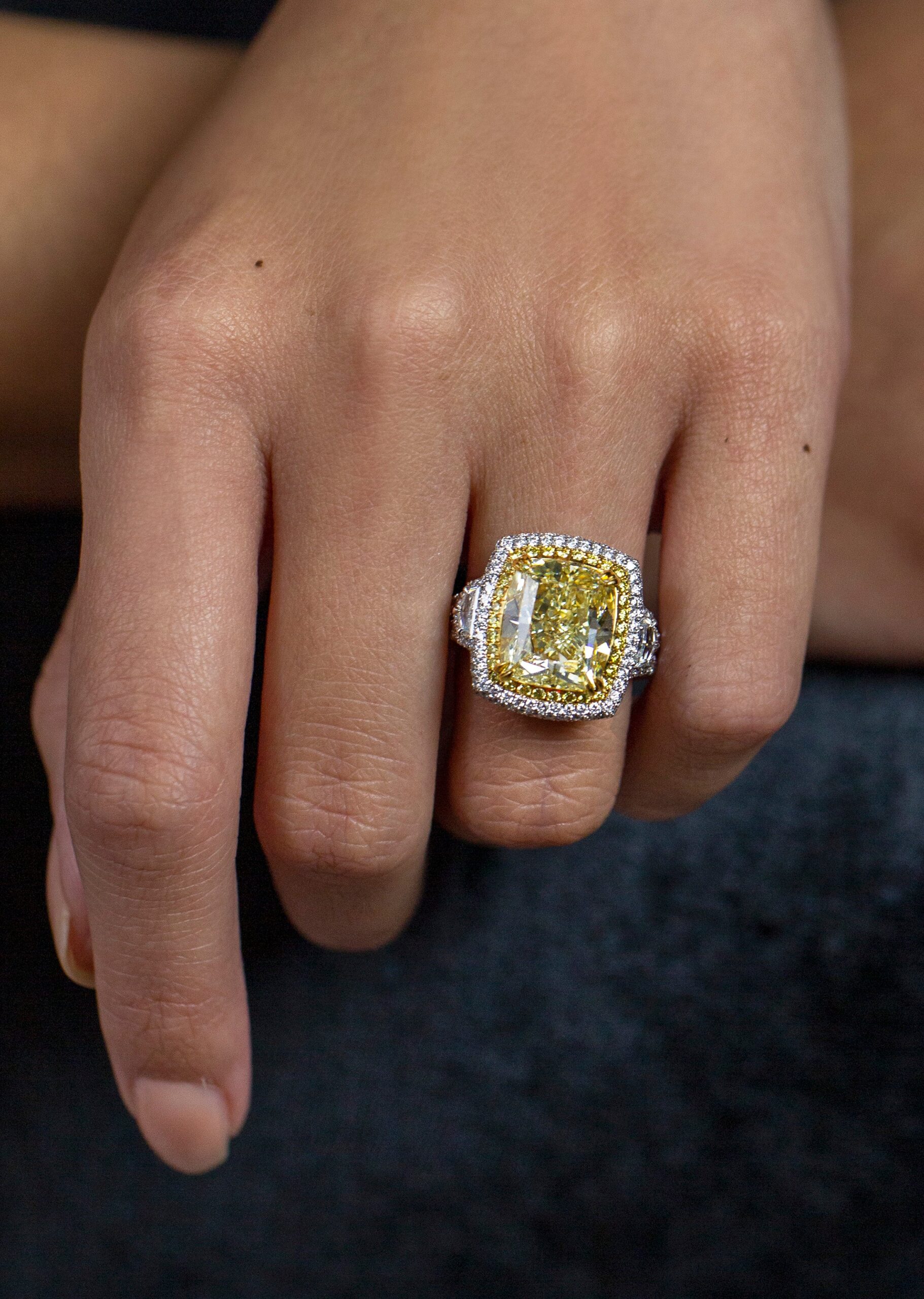 Be the first to review “GIA Certified 8.77 Carats Cushion Cut Yellow Diamond Double Halo Engagement Ring in Yellow Gold & Platinum”