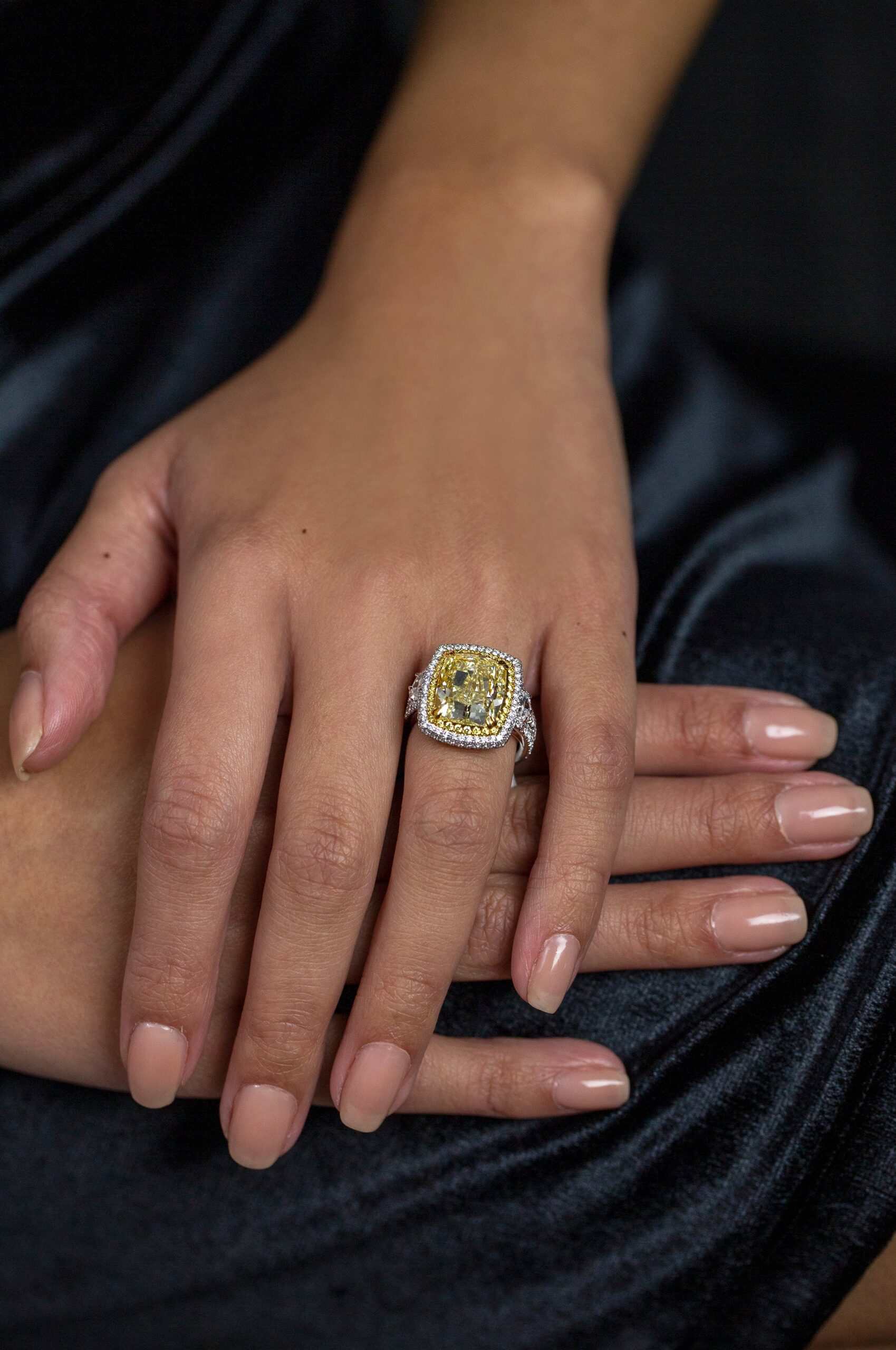 An impeccable engagement ring, featuring a vibrant 8.77 carats cushion cut diamond certified by GIA as Light Yellow color and VS clarity, set with a double halo of round cut yellow and white diamonds. Flanked by epaulette cut diamonds and accented by two rows of a diamond encrusted split-shank in a half-eternity design. Accent diamonds weigh 2.34 carats total and accent yellow diamonds weigh 0.27 carat total. Finely made with an 18K yellow gold and platinum mounting. Size 6.25 US, resizable upon request.  Serenity Gallerie is a custom house, specializing in creating anything you can imagine. If you would like to receive a special quote on a custom piece, please message or call us.