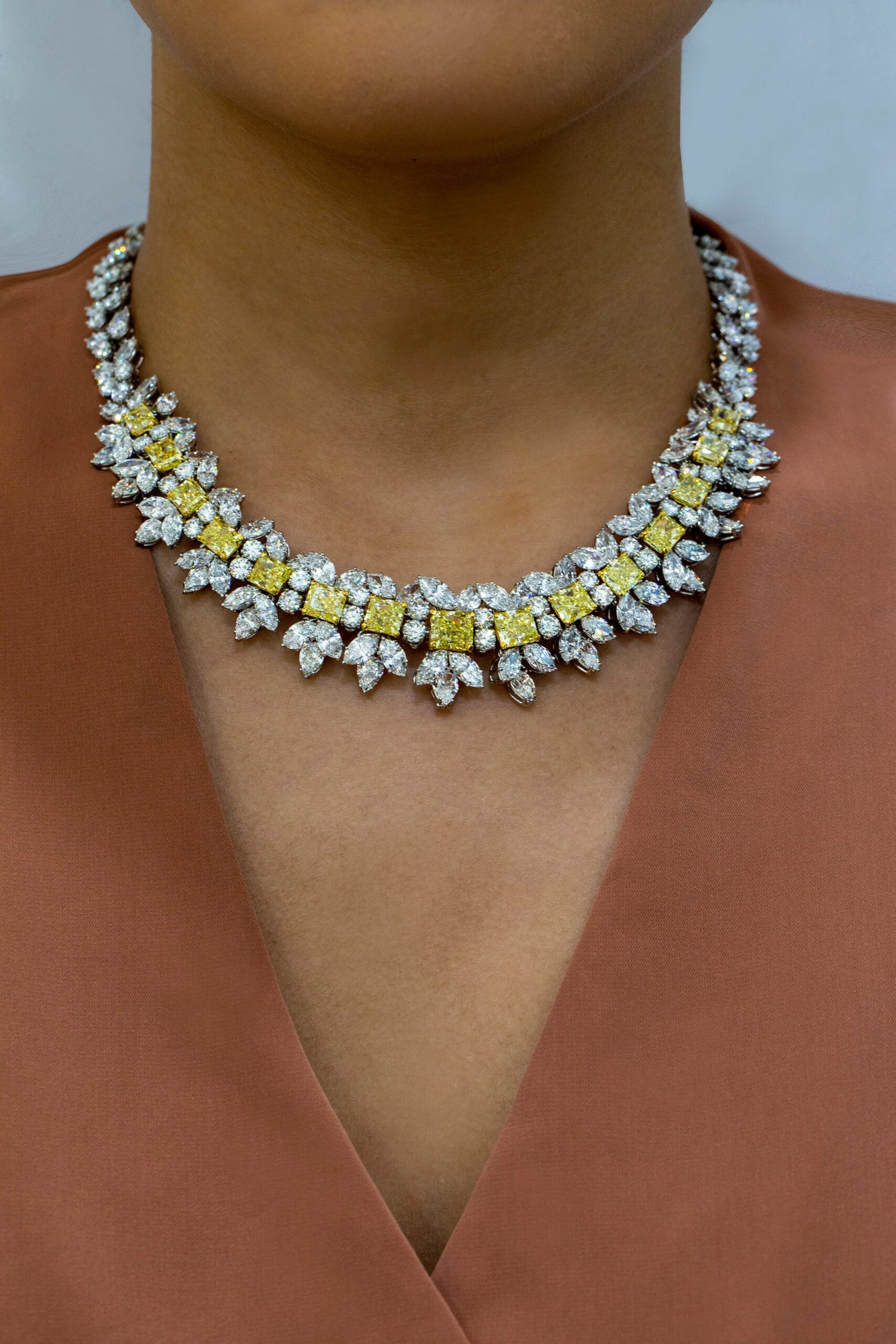 A rare diamond necklace, showcasing one row of graduating radiant cut diamonds weighing 23.45 carats total certified by GIA as Fancy Intense Yellow color, set on 18K yellow gold. Accented by marquise and round brilliant cut diamonds weighing 62.82 carats total, set on platinum in an intricate design. Inner circumference: 14 inches. Perfect for luxurious events.  Serenity Gallerie is a custom house, specializing in creating anything you can imagine. If you would like to receive a special quote on a custom piece, please message or call us.