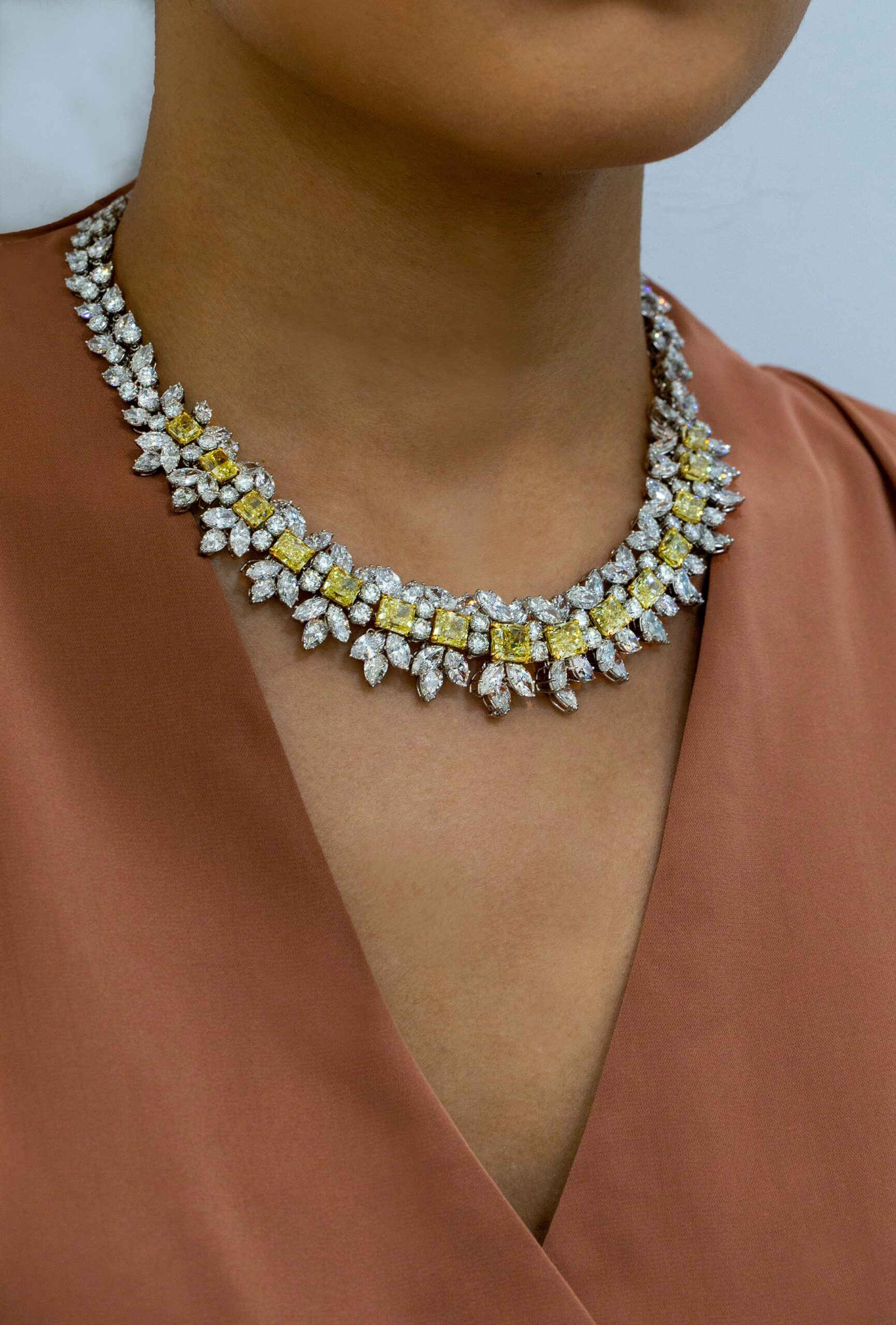 GIA Certified 86.27 Carats Total Yellow & White Diamond Necklace in Yellow Gold & Platinum