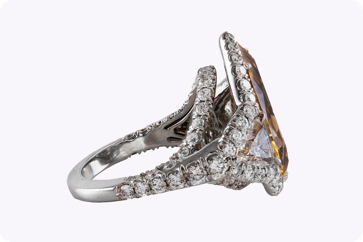 A beautiful engagement ring, featuring a 9.63 carats pear shape diamond certified by GIA as Fancy Deep Brown Orange color and VS1 clarity, set on a four prong setting. Flanked by trillion cut diamonds weighing 1.15 carats total. Accented by a halo of round brilliant cut diamonds and a diamond encrusted shank in a half-way setting. Accent diamonds weigh 2.30 carats total. Finely made with a platinum mounting. Size 6.5 US, resizable upon request.  Serenity Gallerie is a custom house, specializing in creating anything you can imagine. If you would like to receive a special quote on a custom piece, please message or call us.